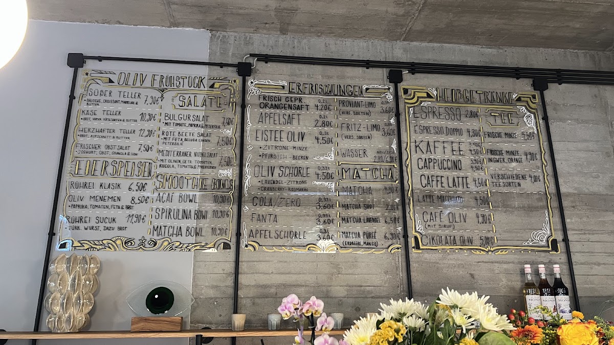 The menu at Oliv Coffee & More offers a variety of beverages and light food options suitable for different times of the day, including breakfast, coffee breaks, and casual meals. The main focus is on coffee drinks, including specialty options such as latte macchiato and matcha latte. Alongside the beverage selection, customers can find a range of cakes, pastries, and baked goods.